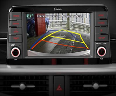 Using a waterproof rear camera and the 7-inch dash display, the rear view camera projects dynamic guidelines onto the image to recommend a path as the driver reverses.